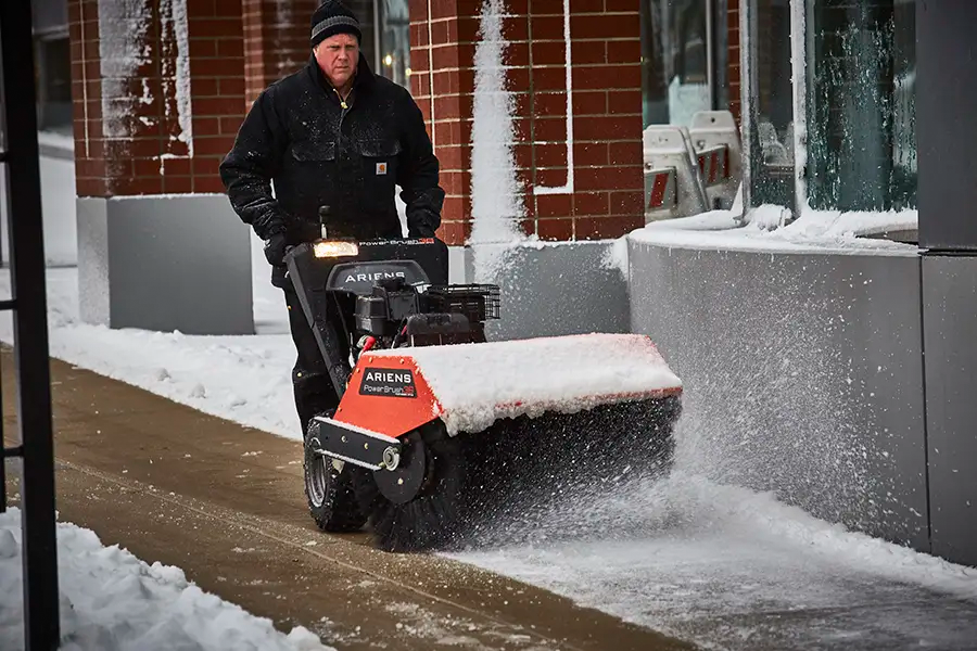 When clearing lighter and slushier snowfalls in areas with heavier pedestrian traffic like metro areas and college campuses, commercial power brushes are sometimes preferred because power brush discharge is typically low to the ground, lighter and more evenly dispersed. Additionally, their high-strength nylon bristles help ensure a clean sweep down to the surface. The technology of an Ariens power brush is nearly identical to Ariens Sno-Thro models, mimicking their strength, power and reliability. Available in 28- and 36-inch widths, both models feature adjustable brush heads that can be positioned straight forward or 20 degrees to the left or right. Like with certain professional snow blower models, the Hydro Brush 36 model has a hydrostatic transmission and doesn’t need to be stopped to speed up or slow down.