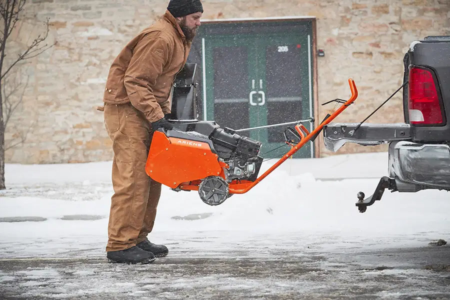 Some brands offer an all-in-one type of commercial snow and ice removal vehicle. If you’re clients require clearance of large areas such as parking lots or city sidewalks, an all-in-one may be best for you. These vehicles offer different snow/ice removal attachments that can be easily switched out. All-in-one vehicles offer more power and speed for clearing large areas. A stand-on snow removal vehicle takes away the physical stress a walk-behind snow blower puts on the operator, which is perfect for a business that must remove snow quickly and at high volumes. For example, the Ariens Mammoth 850 is a four-wheel-drive stand-on vehicle with useful attachment options (v-plow, snowblower, blade, power brush, brine de-icing system, salt spreader). The Mammoth boasts a 28.5hp Kawasaki 850V-EFI engine perfect for the professional who needs to clear an immense amount of snow.