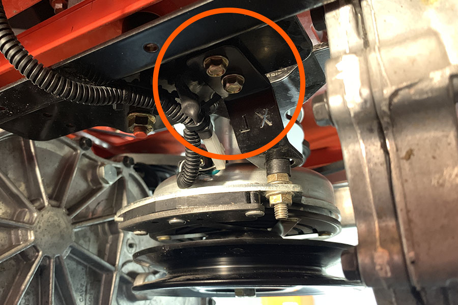 2. Reinstall the clutch stop bracket onto the clutch stop and secure to the transaxle brace. For best results, secure the bracket to the brace from behind the unit with your fingers. Tighten as much as finger tightening allows, then use a socket wrench to secure.