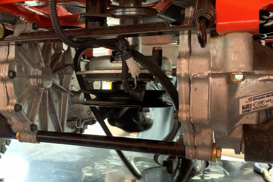 The Hydro-Gear® transaxles on an Ariens® zero turn lawn mower are not directly driven by the lawn mower engine itself, but by a belt. The transaxle drive belt is routed through an engine pulley, idler pulleys and the pulleys on the top of the transaxles. When the engine is running, the belt is turned by the engine pulley and the belt then turns the transaxle pulleys, supplying power to the transaxles and allowing them to drive the wheels when the steering levers are moved by the operator.